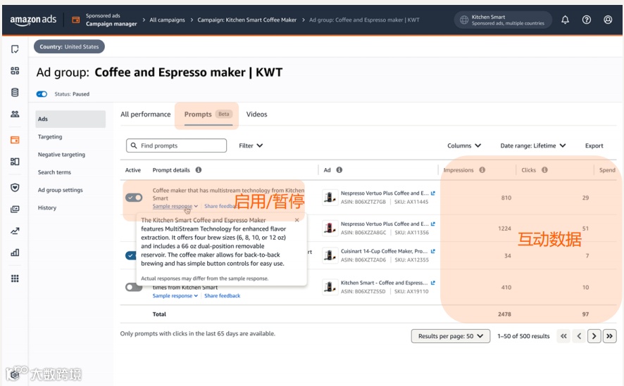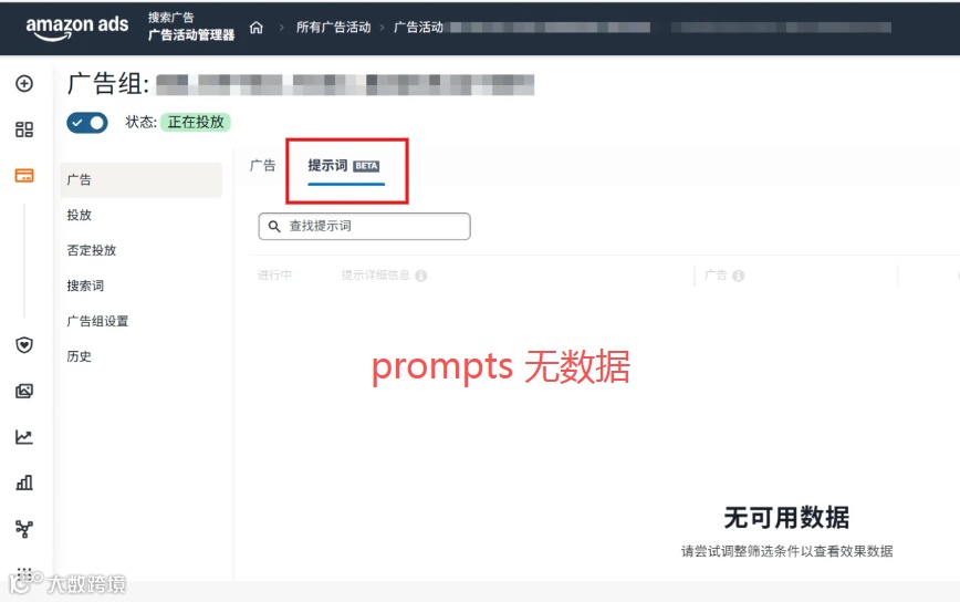 卖家可在现有广告活动的“提示词(Prompts)”模块中管理Rufus广告。需注意:该功能类似自动广告,依赖亚马逊系统抓取与理解Listing内容。若后台提示词栏为空,表明当前ASIN尚未被Rufus识别,需优先优化Listing文本结构、属性字段及语义丰富度,提升AI可读性。