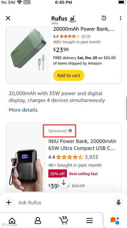 同步追踪ABA数据可见:Rufus推荐集中度提升期(10–12月),正是INIU关键词份额快速登顶阶段。此外,INIU已率先接入Rufus广告系统,在手机端Rufus推荐中稳定出现品牌广告位。