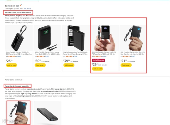 在Rufus首页搜索“Power bank”,INIU品牌包揽推荐位前4名中的3席;在预设问题“Recommended power bank brands”中,5款推荐产品涵盖2个INIU型号;在“Power bank sizes and capacities”问答中,与Anker并列主导推荐结果。