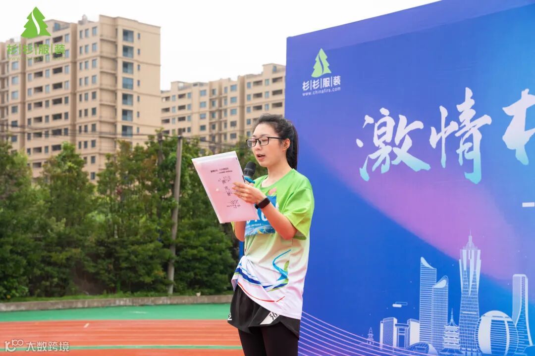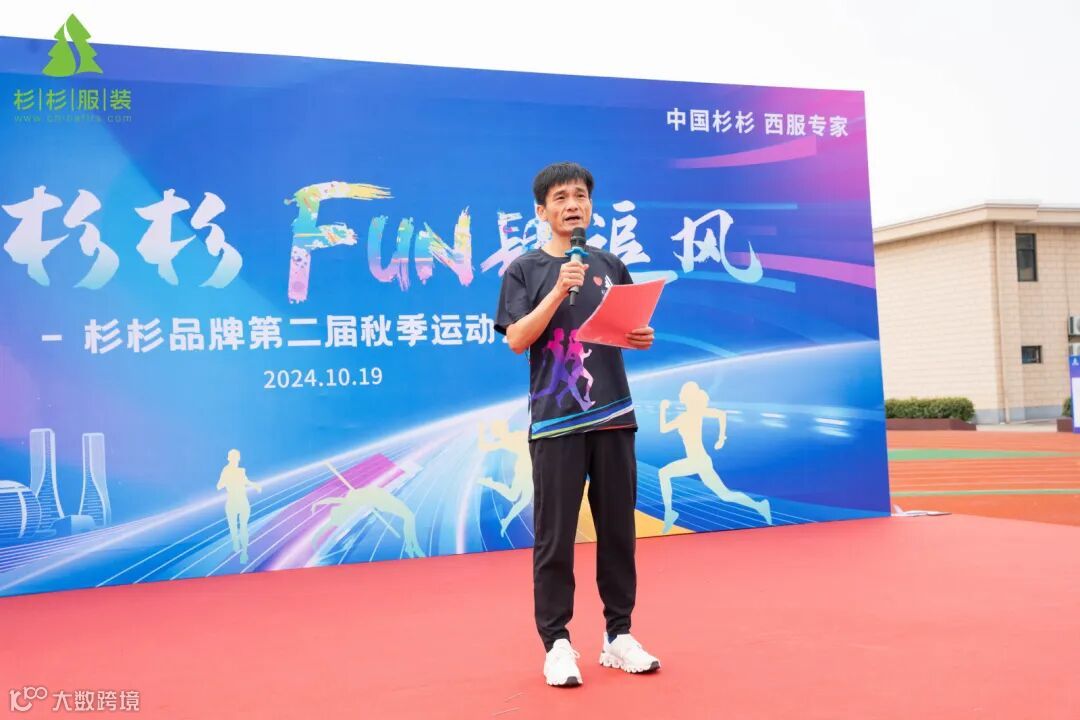 今天放下手头的工作,大力举办运动会,目的就是打造积极进取的企业文化,展现我们杉杉服装人积极向上的精神风貌。此次运动会既有个人赛,让有实力的伙伴一展风采;也有团体赛,考验团队的协作能力配合能力。我希望大家在保障团队和个人安全的前提下积极参与,秉持“创先争优、进取向上”的热情,在赛场上奋力拼搏,赛出成绩,赛出风格。年关冲刺即将来临,让我们在运动中释放压力,收获快乐和友谊。相信通过这次运动会,我们的团队将更加团结,更有凝聚力。