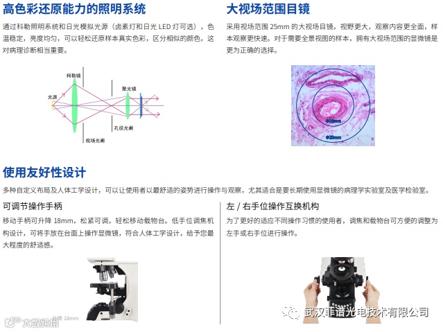 通过不断探索病理学、细胞学和病毒学等专业领域的研究需求,不断对 NE900 科研级正置显微镜进行优化和升级, 使其具有近乎完善的光学性能和机械结构设计。NIS 无限远光学系统成像精确、色差矫正能力强,搭配色彩还原度高 的照明系统、高品质的光学部件以及功能齐全的附件,使这台显微镜特别适合对暗视场、微分干涉相衬或高性能荧光 等有需求的尖端生命科学研究。另外,多种电动和智能部件以及功能强大的成像软件,满足快速概览样品和详细检查 样品的需求,轻松完成重复性工作,大大增加了操作的简便性,增加操作舒适性,最大程度的提高工作效率。无论是 临床检验室还是科研实验室,都可以提供理想的显微成像解决方案。