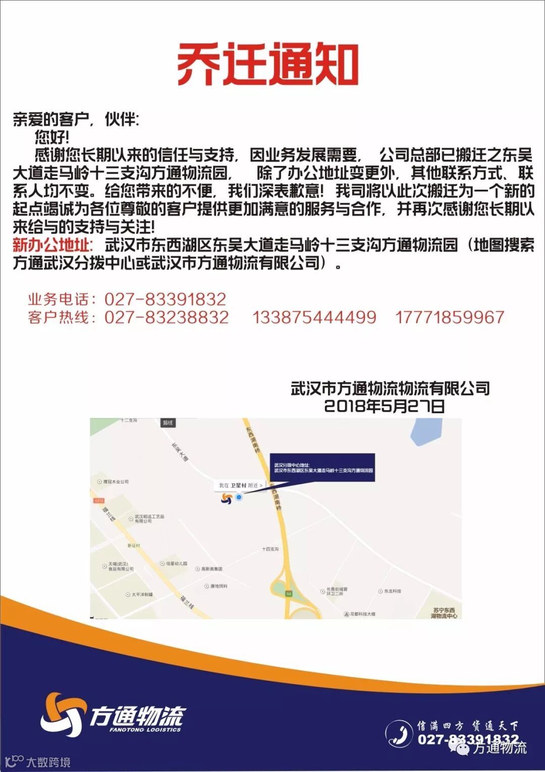 导读:湖北方通物流武汉分拨中心乔迁通知