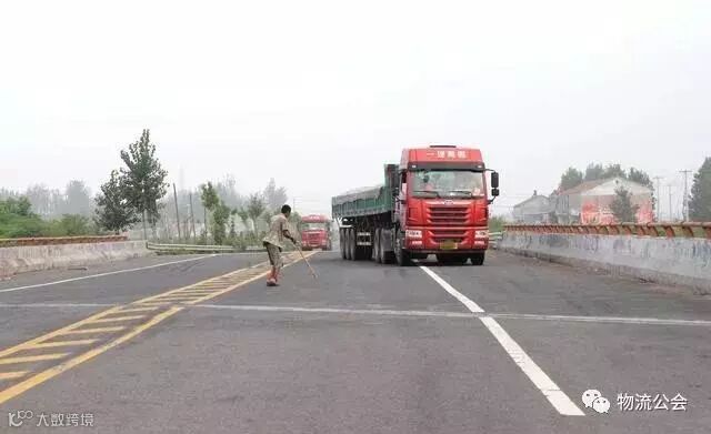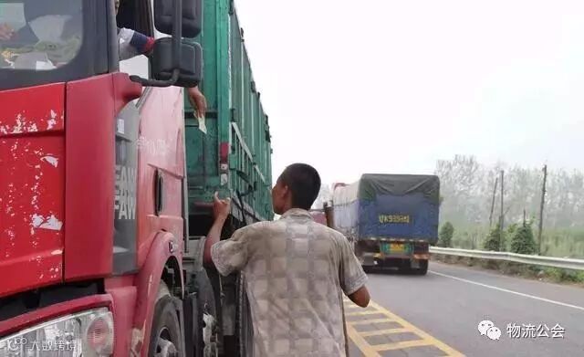 图:该男子刚从一辆大车上要了1元钱,并“放行”了车辆。
