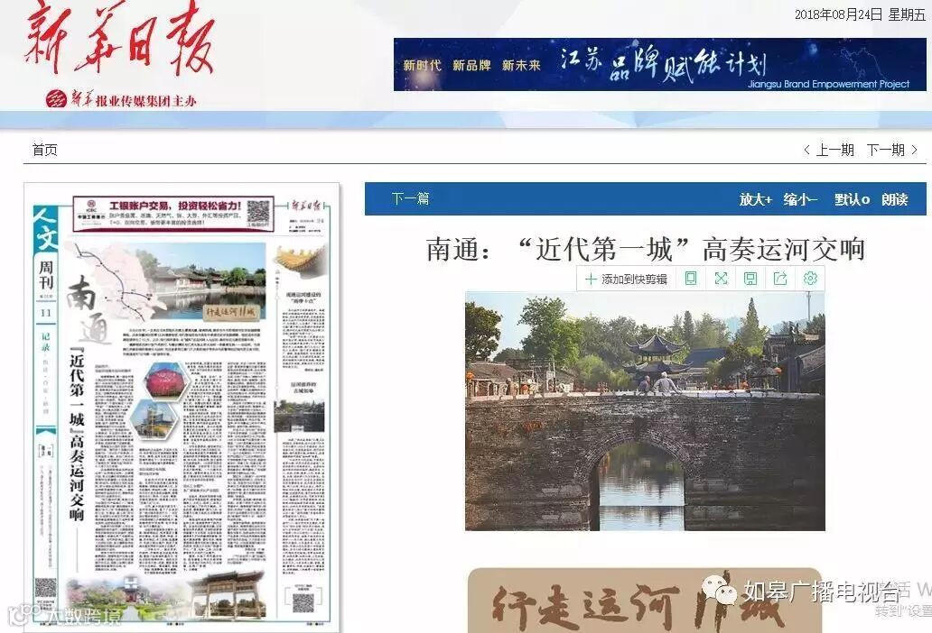 8月24日新华日报以《南通: “近代第一城”高奏运河交响》为题大幅度地报道了如皋的运河文化,文中提及:“目前,如皋留存有天下第一运盐河。”早在北宋年间,盐运河就已经有明确的历史记载。著名的旅行家马可波罗到南通时,留下:“通州城市面积不大,一切生活必需品的供应十分充足。”的记载。运盐河南通段流过海安、如皋、港闸等地区,两岸留存大量的古遗址、民居、园林、寺庙、古镇、历史街区、水工设施、盐垦遗产、民族工商业遗产,构成了南通丰富多样的大运河文化遗产。