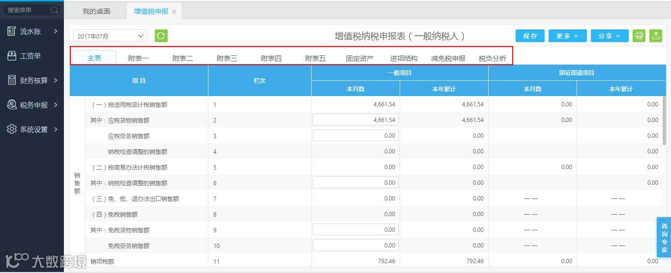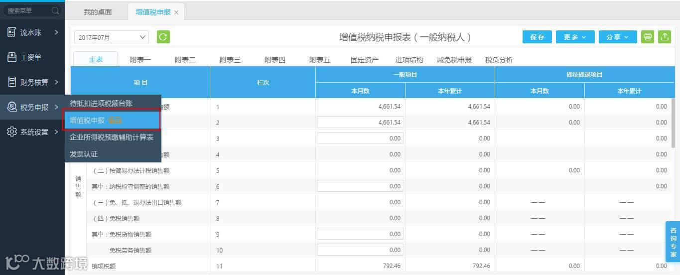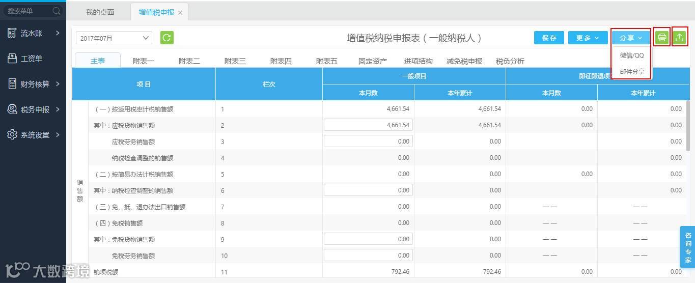 通过录入流水账可以自动生成一般纳税人增值税申报表,免去手工算税的工作避免出现疏漏。税表可通过微信、QQ、邮件等方式分享,还可以打印、下载EXCEL文件保存。
