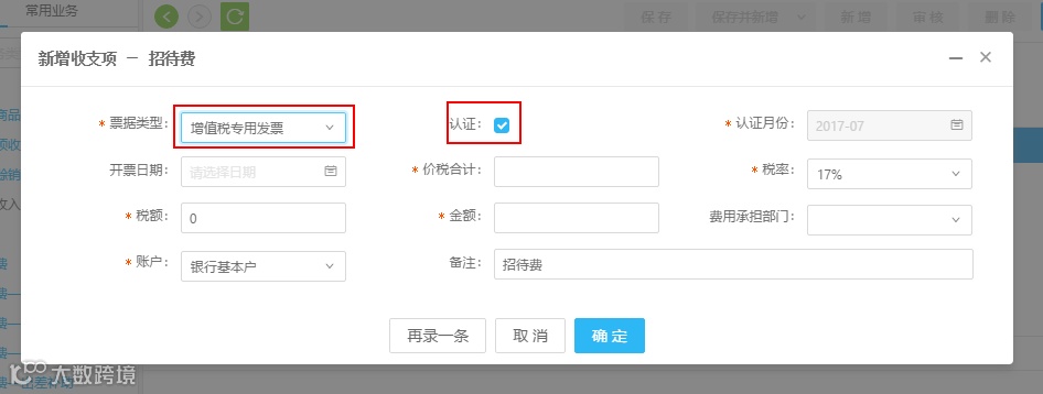 (5)“招待费”、“银行手续费”,对应票据类型增加“增值税专用发票”