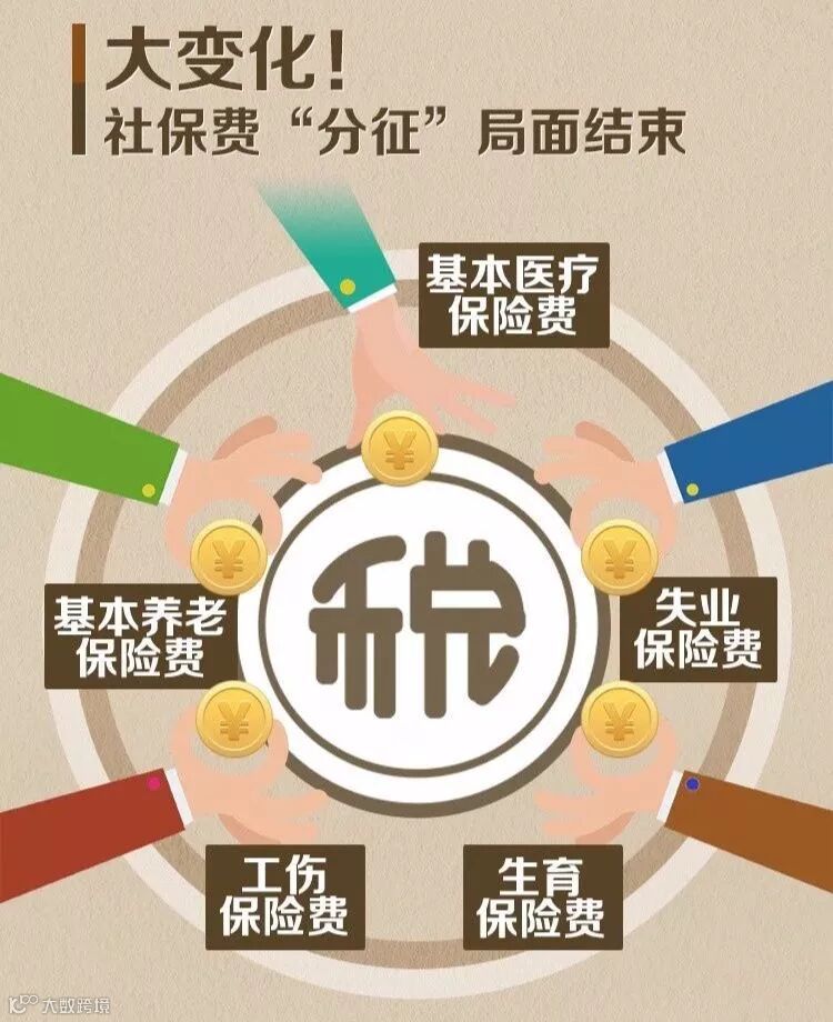7月20日,《国税地税征管体制改革方案》正式印发,明确自2019年1月1日起,基本养老保险费、基本医疗保险费、失业保险费、工伤保险费、生育保险费等各项社会保险费交由税务部门统一征收。