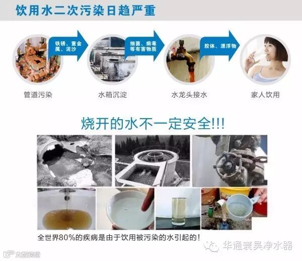 从水厂到居民家中漫长的输送管道产生的二次污染,镀锌管长时间使用,锈蚀和洞穿会产生大量锈蚀物,这些都不是水烧开所能解决的。以及二次供水的水塔水箱大部分长期无人清洗和管理,造成了污染源。