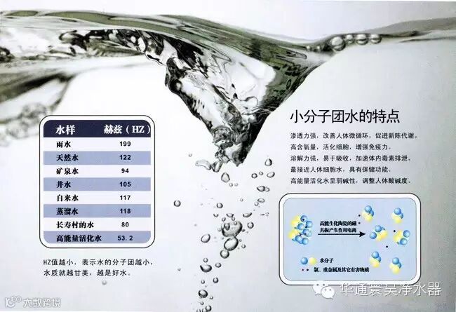 水分子团的水有什么好处呢?因为水的分子团越小,水的能量就越大,水的渗透力、溶解力、代谢力就越强。因其分子团小,更容易进出细胞膜,运送养料,带出垃圾,成为最佳的运输载体,因此说小分子团的水是最适合人体细胞的水。