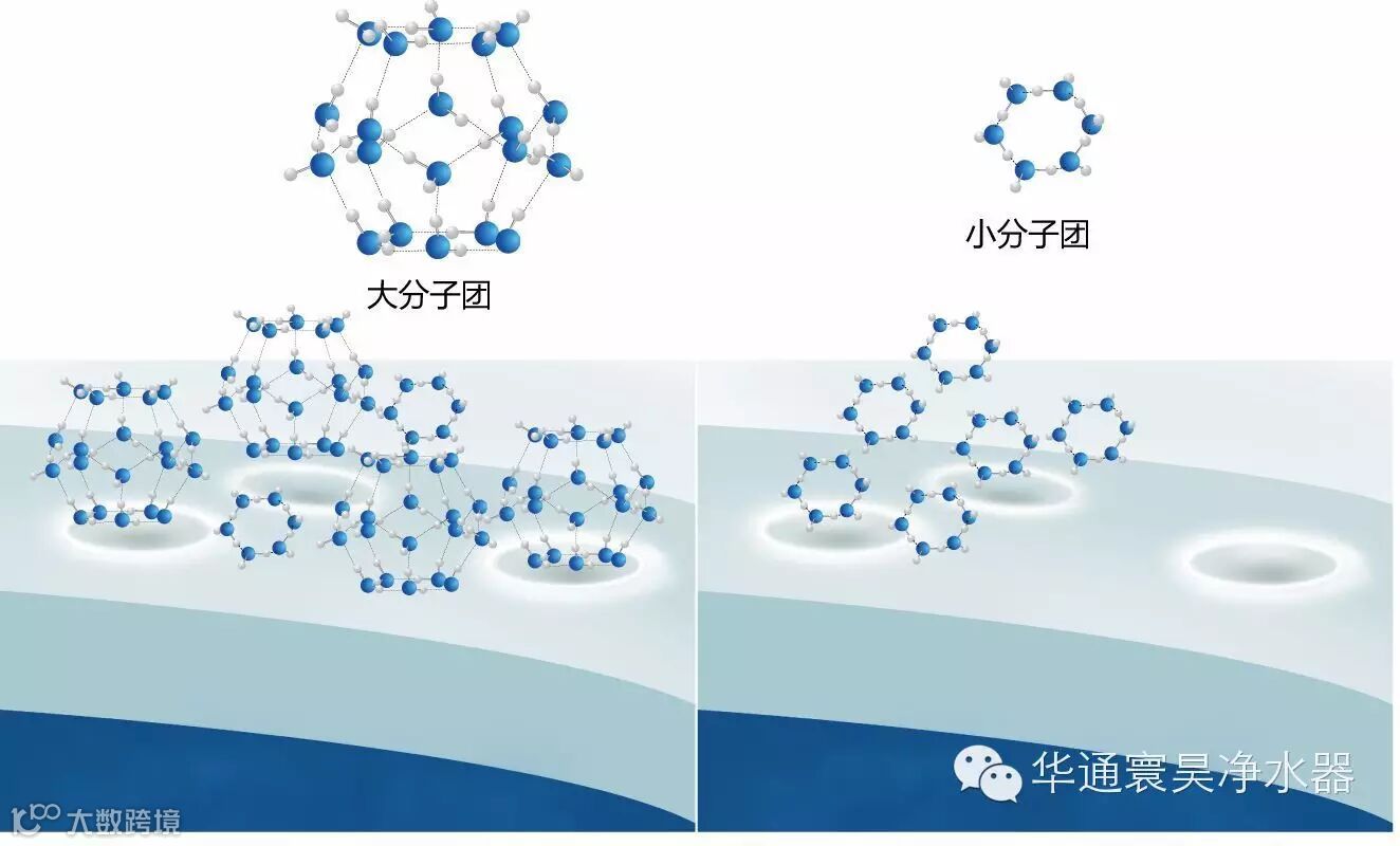 水是以多个分子组合在一起存在的。长寿村的水、天然的流动着的无污染的山泉水、原始冰川水、都是小分子团的(3—6个水分子组成).核磁共振测得水的半幅宽度为 70HZ左右。 很容易进出细胞膜的水通道。其运动速度快,具有极强的渗透力、扩散力、溶解力、代谢力 ,更容易通过细胞内外水的交换,清除自由基、有害酸性代谢物和各种废物,促进细胞的生长发育,保持细胞的生命活力。自来水大分子团(13个分子以上)核磁共振测得水的半幅宽度为 110—130HZ很难进出细胞膜。结合细胞膜水通道直径把小于 100HZ 由6个水分子组成的水称为小分子团水。挑食的细胞只喝小分子团水。