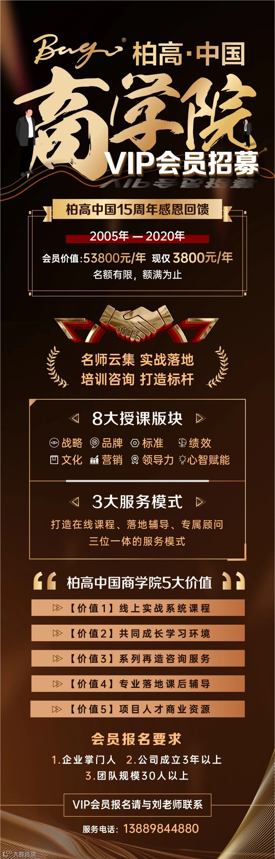 柏高中国商学院是由柏高中国管理咨询机构主导并成立的企业管理课程研发开设及商业资源整合的一体化平台,商学院坚持“创民族品牌、复兴中国梦”的使命,通过企业再造、品牌再造、标准再造”等系列再造线上课程、线下沙龙及辅导,以新视野、新思维、新格局的前瞻性发展战略,积极推动平台内成员企业成为行业龙头,完成由区域到全国、由全国到国际的跨越式发展!