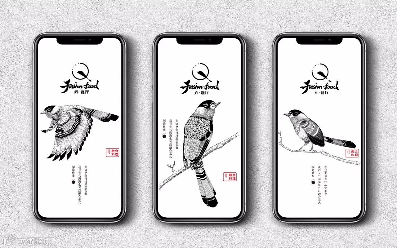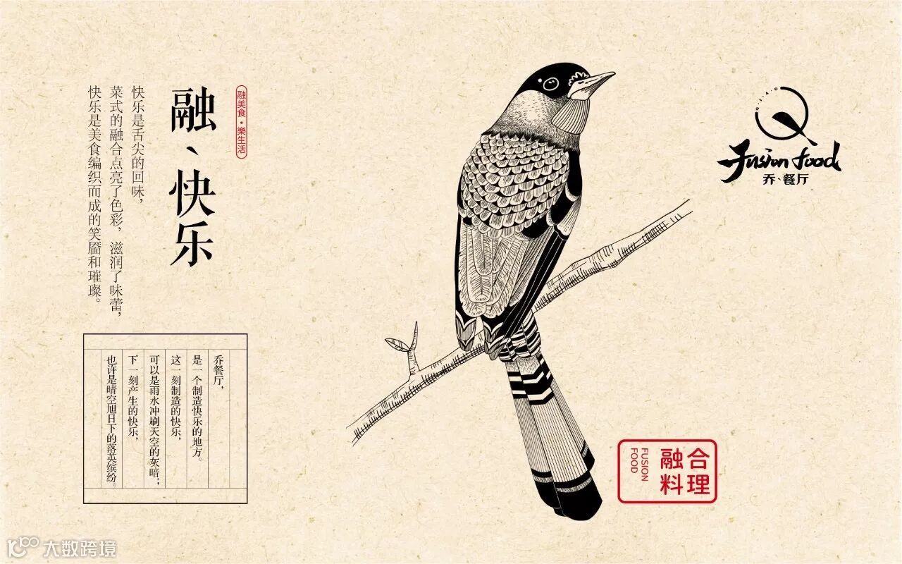“Q”是业乔拼音名称的首字母;餐具的碗和汤匙符合餐饮属性,俯视图又近似“Q”;鸟儿栖息枝头的轻松与随性正是乔餐厅所要营造的休闲感受。正是沿着这一思路,柏高项目组设计出了乔餐厅的品牌LOGO以及一系列的辅助图形,展示品牌形象。