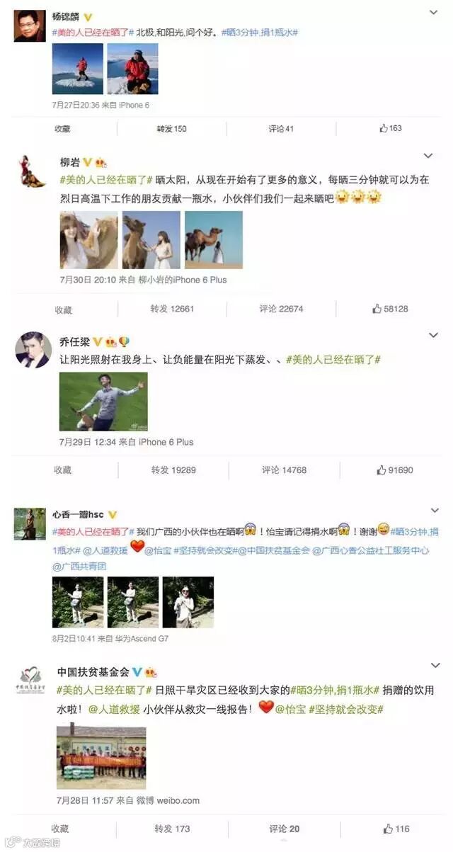 而这种触动人心的活动更是吸引了近百位文化界、体育界和娱乐圈名人踊跃参与,汪涵、蒋方舟、高群书、杨锦麟……纷纷秀出自己的“纯心晒”行动,公益行动的微博话题#美的人已经在晒了#成为搜索热词,引发全民UGC公益风潮,短短几天就拥有过亿的阅读量和逾十万网友的参与,而他们的爱心也在活动的第三天就到达需水人群的手中。更有网友受此活动启发,自发走上街头以高温实验的方式,感同身受户外工作者的艰辛和付出,并全程以视频记录拍摄,呼吁社会更多的关注和关怀。