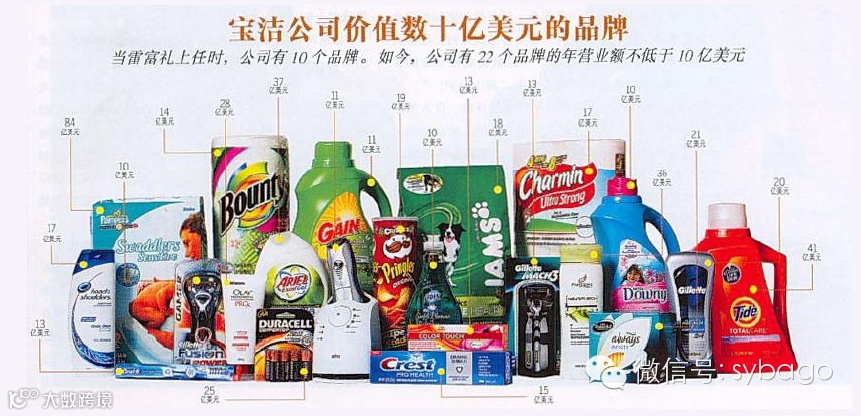 宝洁公司是多品牌战略成功的典范,旗下小品牌数百个、独立大品牌80多个,其产品覆盖洗发护发、美容护肤、个人清洁、妇女保健、婴儿护理、家居护理等诸多领域。宝洁旗下洗发水品牌有潘婷、海飞丝、飘柔、沙宣等;洗衣粉有汰渍、碧浪等;牙膏有佳洁仕,香皂有舒服佳,卫生贴有护舒宝;化妆品有SK-II、玉兰油、威娜、伊卡璐、妮维雅等;另外还有吉列、博朗、锋速3、品客、金霸王等。目前,宝洁有九大类、十六个品牌进入中国大陆市场。