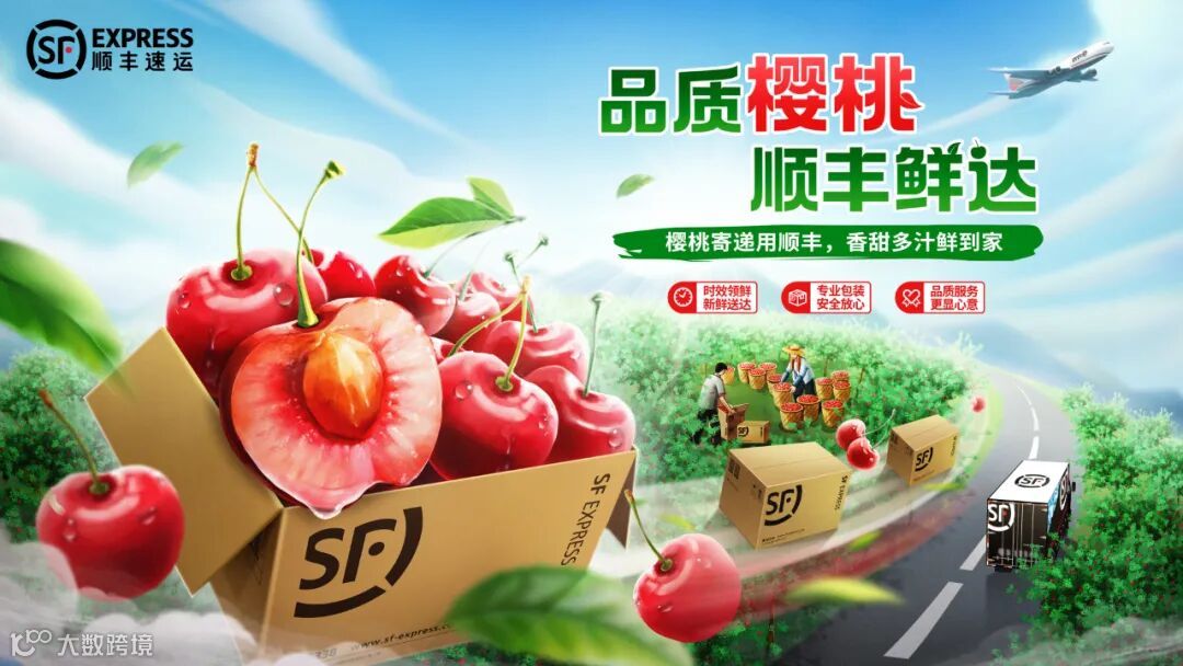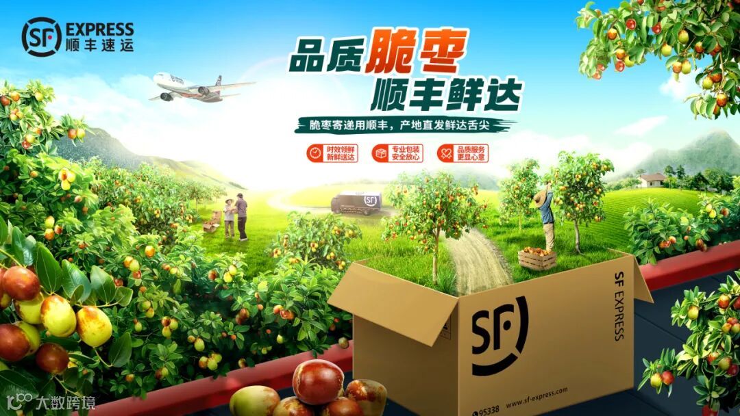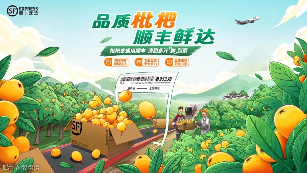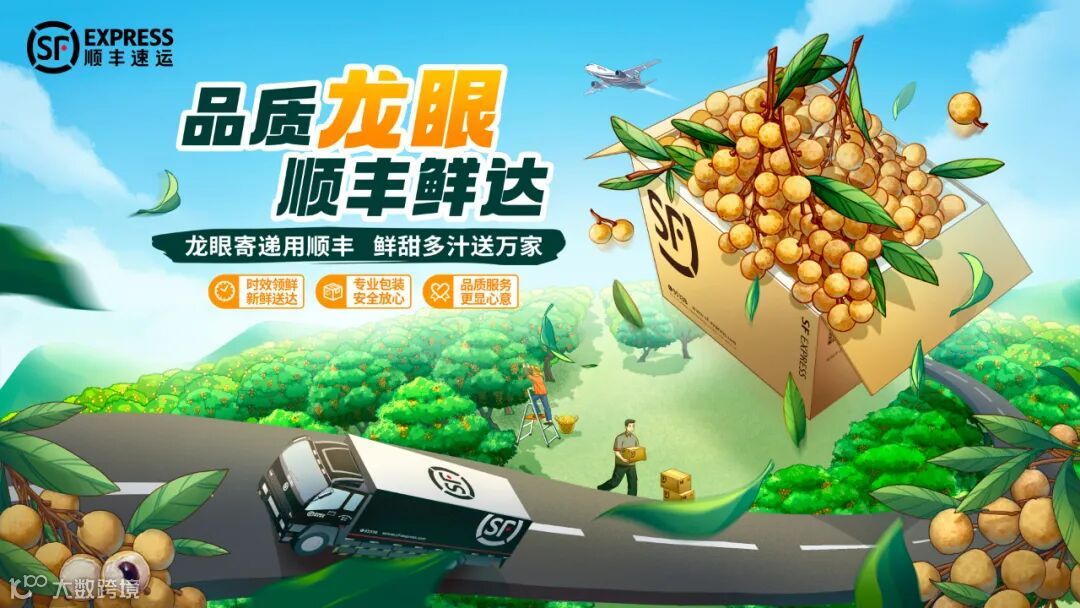 就是让画面中的元素按近景、中景、远景分布,比如在下图中,画面左右两边的枇杷是近景,装满枇杷的顺丰纸箱和快递单是中景,远处的顺丰车、果树和山是远景,并且这三层景沿着一条传送带由近及远,空间感关系由此得到强化。