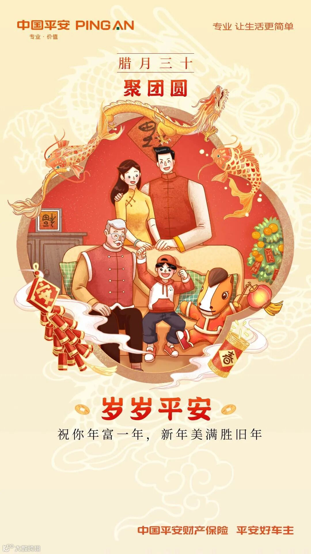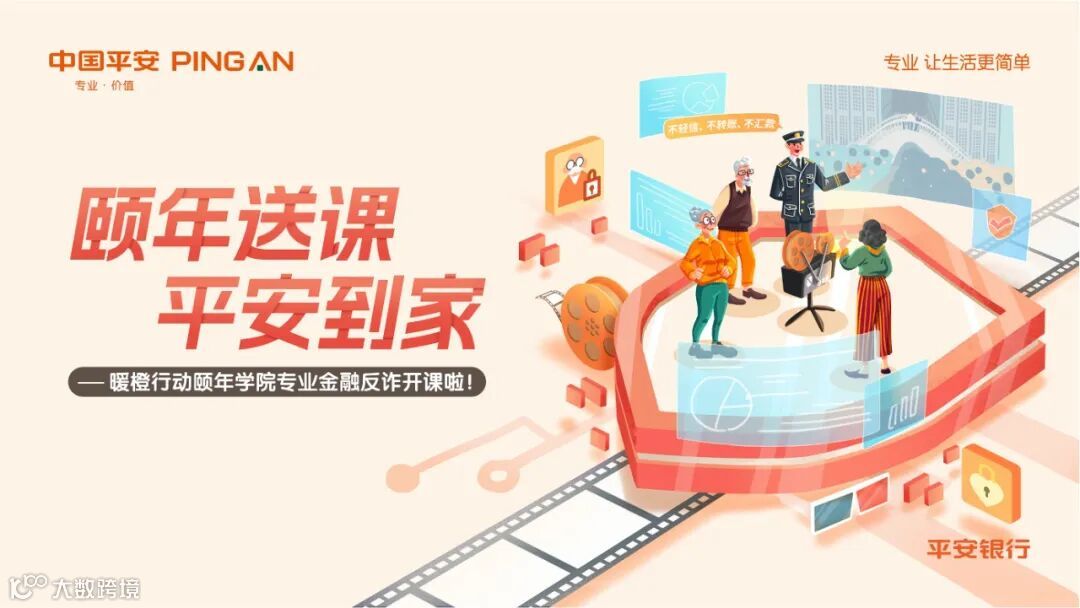 主体除了要大以外,也要尽量减少干扰,能让画面更精致的点缀元素可以有,但不能太多,也不能太抢眼,否则就会对主体造成干扰。另外,还要给主体一定的留白,不要把其他元素全部放在主体周围,例如在下图平安颐年反诈宣传的kv设计中,因为视觉主体已经有比较多的元素和细节,所以装饰做了尽可能的弱化处理,背景更是用了单色,所以标题和视觉主体都得到了有效突出。