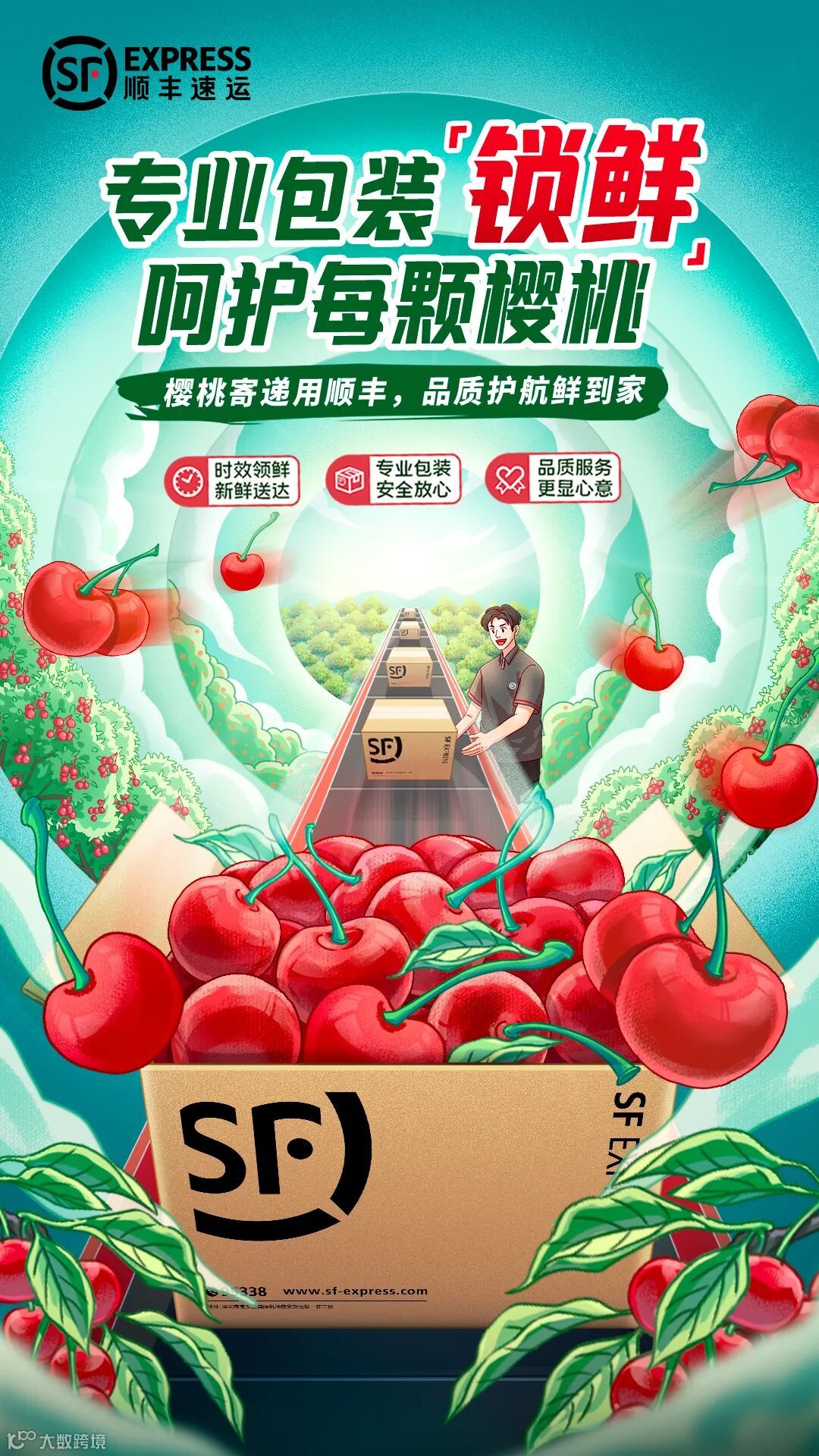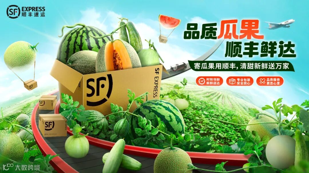 所以,有时候我们就得把主体放大一点,当然,相应的其他元素要小一点,这样才能拉开对比、强化视觉层次。例如我司在为顺丰特色经济设计kv时,通常会将装满产品的顺丰纸箱作为主体重点突出,以让用户一眼就能看到寄递到产品以及快递公司,顺丰车、专机、顺丰小哥、果农等元素则会弱化处理。