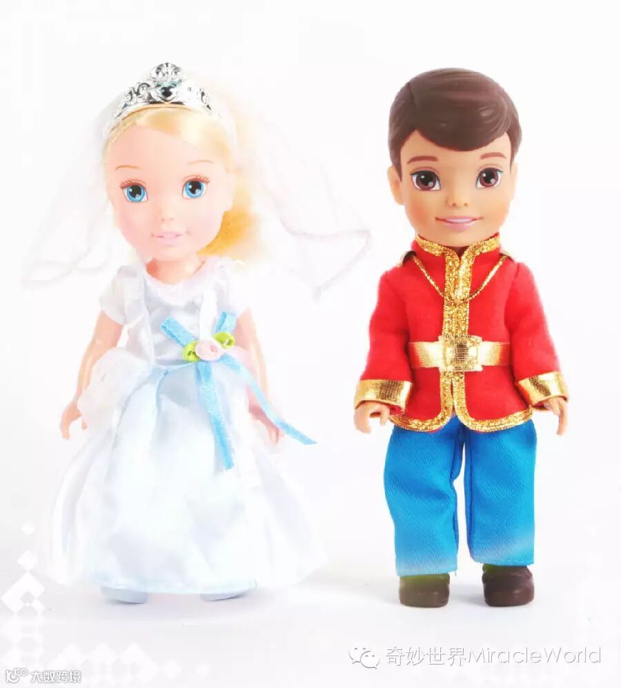 这是一款按照动画《仙履奇缘》中灰姑娘和王子形象所设计的儿童套装玩具,由一个公主娃娃和王子娃娃组成。公主娃娃精致漂亮,戴着皇冠,披着头纱,穿着白色的婚纱,非常唯美;小王子一身健康的咖色肌肤,穿着皇家礼服,优雅帅气。