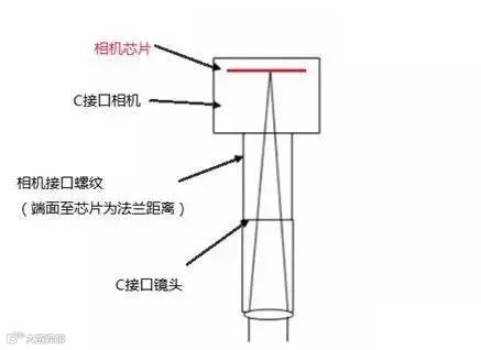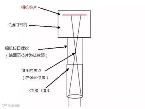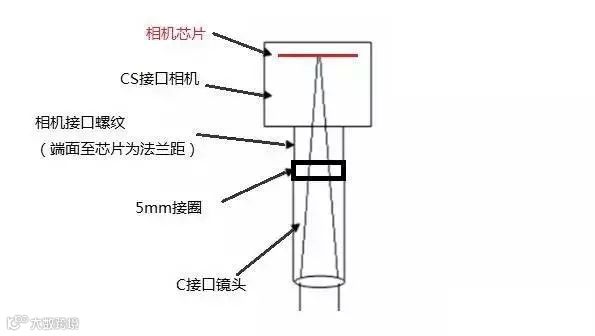 而CS接口,螺纹规格和C接口相同,但是法兰距离为12.526mm,比C接口短5mm,因此 C接口镜头配合CS接口相机时,需要加一个5mm的接圈,否则成像位置会在芯片之后,如下图——