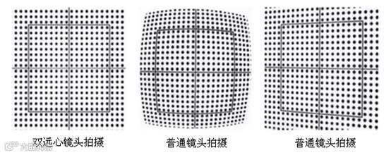 左图为双远心镜头拍摄的畸变测试图,完全无径向畸变或梯形畸变;中图为明显径向畸变;右图为明显梯形畸变。