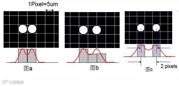 我们知道,物体是成像在相机芯片上的,物方的两个点,经过镜头系统成像在相机芯片上的最小距离,只有如图c所示时才能被分辨开来。若物方两点成像在芯片上的距离如图a, 图b所示时,这两点都不能被分辨开来。因此镜头的像方分辨率=2x像元尺寸时,说明此时镜头分辨率与相机完全匹配。如相机像元尺寸为5um, 镜头放大倍率为0.5倍。则有Resolution(物)=2x5µm/0.5=20µ m时,镜头与相机完全匹配。若Resolution(物)<20µm, 说明此时镜头过好,相机分辨率将成为系统的限制;若Resolution(物)>20µm, 说明此时相机过好,镜头分辨率将成为系统限制。