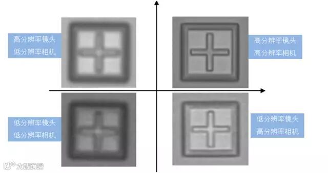 提到分辨率,大部分工程师会想到相机分辨率,而忽略镜头的分辨率对最终成像效果也起到关键作用。事实上,只有镜头分辨率和相机分辨率匹配,才能得到最佳成像效果。下图直观的表示出镜头和相机匹配对成像效果的影响。