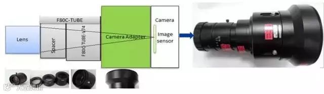 对于线扫镜头或大面阵镜头,通常其后截距比较大, 这样也可以兼容市面上的各种不同法兰距离的线扫描/大面阵相机。例如下图是F80C系列镜头的接圈方式,通过加不同厚度的接圈,可以与法兰距离为46.5mmF口相机,或法兰距离仅有6.56mm的M72接口相机及其他更多的相机匹配。使用时,我们需要根据所选用相机的型号去选择对应的接圈方式,因此通常情况下,线扫镜头的接圈的接法会相对复杂。
