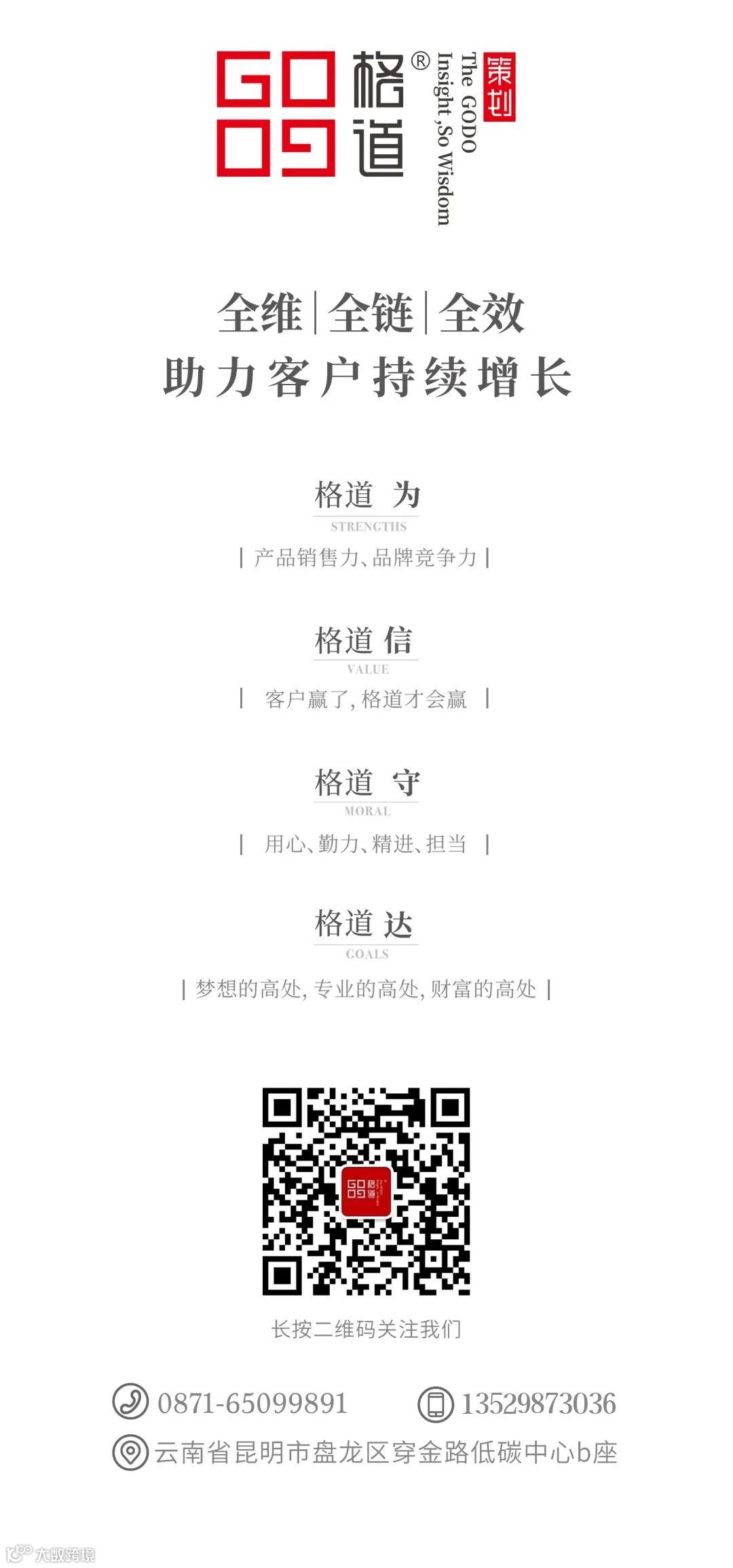 格道策划是一家为企业提供“三位一体”系统性专业服务的集全案营销策划与品牌管理顾问咨询于一身的本土实战公司,也是云南规模较大、专业性较强的品牌营销策划公司。