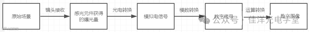 数字图像成像利用图像传感器(CCD、CMOS)把接收到的光信号通过传感器上的光敏单元离散成正比于曝光量的成千上万个像素点,并转换成模拟电压信号,再经过A/D转换处理后变成数字信号,最后经过微处理器的非线性运算转换成图像的标准存储格式。例如BMP、JPEG、TIFF等存储在物理介质上。