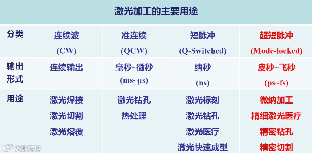 激光加工包含:高功率切割、焊接;微加工之钻孔、划线、切割、纹理、剥除、隔离等,各种激光加工手段的主要用途有: