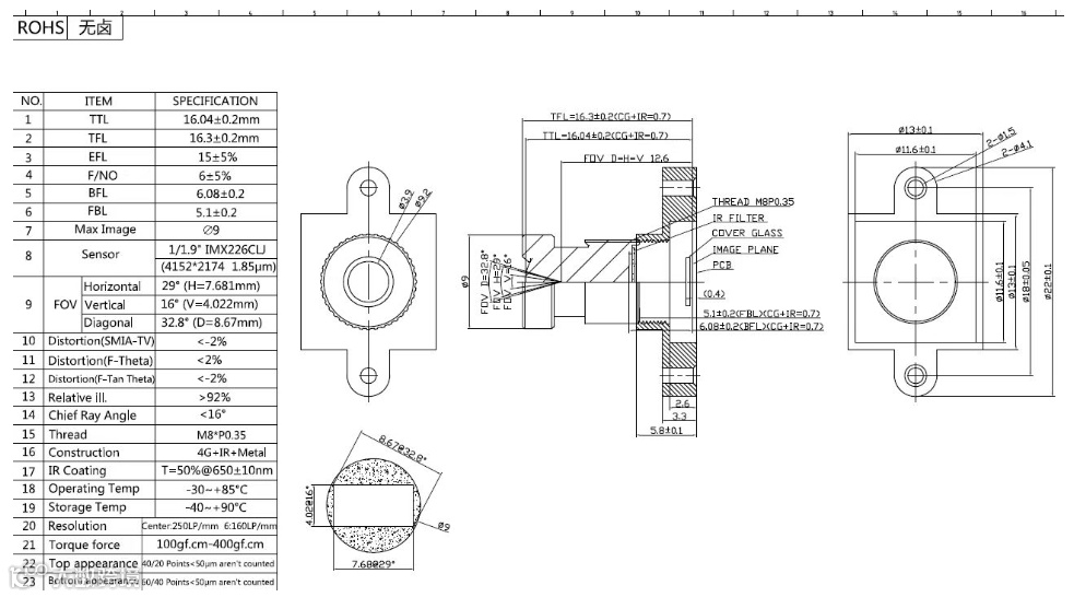 Construction:结构,4G+IR+Metal,4 glass 4片玻璃镜头 ,红外滤光片,金属外壳