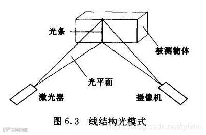 (和上面介绍的三角测距一样)线结构光模式是向物体投射一条光束,光条由于物体表面深度的变化以及可能的间隙而受到调制,表现在图像中则是光条发生了畸变和不连续,畸变的程度与深度成正比,不连续则显示出了物体表面的物理间隙。任务就是从畸变的光条图像信息中获取物体表面的三维信息;