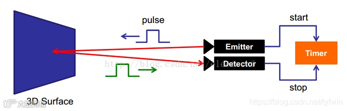 脉冲调制:脉冲调制方案的原理比较简单,如下图所示。它直接根据脉冲发射和接收的时间差来测算距离。