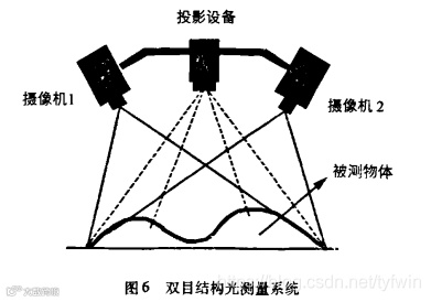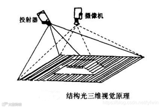 结构光三维视觉是基于光学三角测量原理。光学投射器将一定模式的结构光透射于物体表面,在表面上形成由被测物体表面形状所调制的光条三维图像。该三维图像由处于另一位置的摄像机探测,从而获得光条二维畸变图像。光条的畸变程度取决于光学投射器与摄像机之间的相对位置和物体表面形状轮廓(高度)。