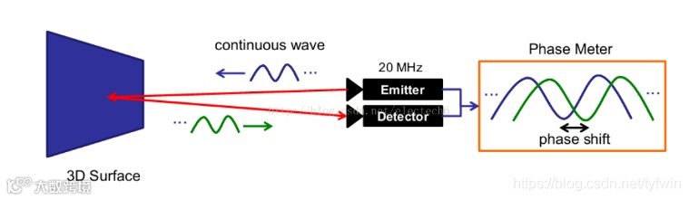 连续波调制:实际应用中,通常采用的是正弦波调制。由于接收端和发射端正弦波的相位偏移和物体距离摄像头的距离成正比,因此可以利用相位偏移来测量距离。