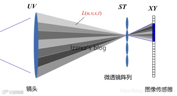这里的细光束也就是光场的离散采样形式,通过微透镜单元的坐标ST和镜头子孔径的坐标UV即能够确定每个细光束的位置和方向,获得L(u,v,s,t)的分布。