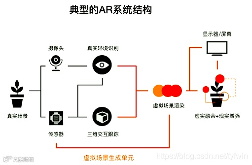 AR增强现实,如下图分两步,先获取周围世界的三维信息,再把虚拟的物体添加到上面,获取三维世界的方法一般是:双目、TOF、结构光。
