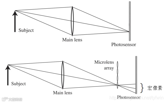 为什么要用这种双平面的方式来确定光场的分布呢?这是因为常规的相机一般都可以简化成两个互相平行的平面——镜头的光瞳面和图像传感器所在的像平面。对于常规的相机来说,每个像素记录了整个镜头所出射光线会聚在一个位置上的强度。