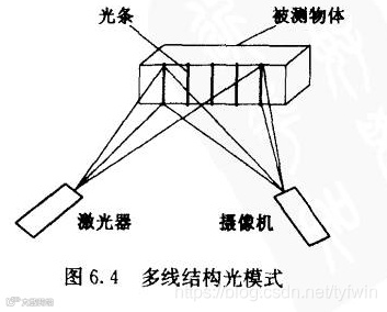 多线结构光模式是光带模式的扩展。如图,由光学投射器向物体表面投射了多条光条,其目的的一方面是为了在一幅图像中可以处理多条光条,提高图像的处理效率,另一方面是为了实现物体表面的多光条覆盖从而增加测量的信息量,以获得物体表面更大范围的深度信息。也就是所谓的“光栅结构模式”,多光条可以采用投影仪投影产生一光栅图样,也可以利用激光扫描器来实现。