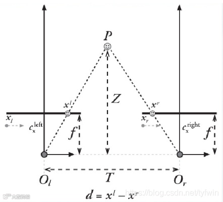 双目立体视觉由三角法原理进行三维信息的获取,即由两个摄像机的图像平面和被测物体之间构成一个三角形。已知两个摄像机之间的位置关系和物体在左右图像中的坐标,便可以获得两摄像机公共视场内物体的三维尺寸及空间物体特征点的三维坐标。所以,双目视觉系统一般由两个摄像机构成。深度和视差成反比。