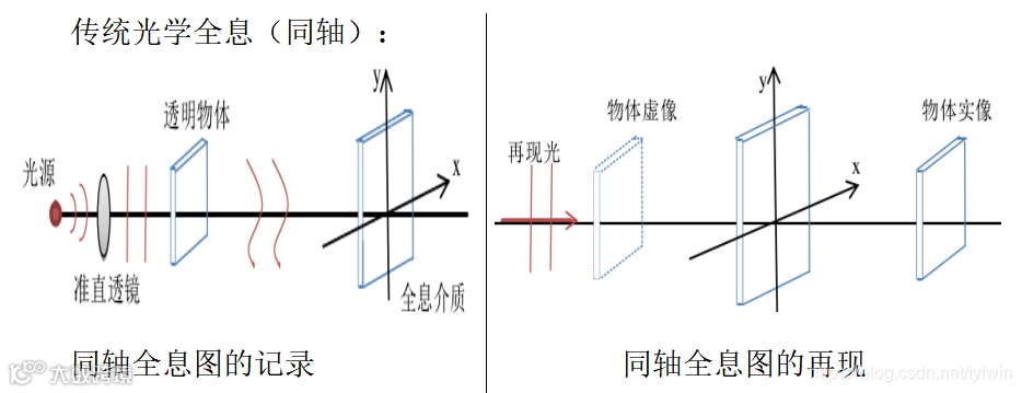 再现的图像立体感强,具有真实的视觉效应。全息图的每一部分都记录了物体上各点的光信息,故原则上它的每一部分都能再现原物的整个图像,通过多次曝光还可以在同一张底片上记录多个不同的图像,而且能互不干扰地分别显示出来。如下图。离轴全息和同轴全息。