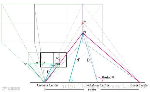 由几何知识可作相似三角形,激光头、摄像头与目标物体组成的三角形,相似于摄像头、成像点P与辅助点P′。P与辅助点P′。