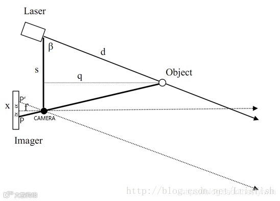 (和上面介绍的三角测距一样)如图所示,激光器发出的光束投射到物体上产生一个光点,光点经摄像机的镜头成像在摄像机的像平面上,形成一个二维点。摄像机的视线和光束在空间中于光点处相交,形成一种简单的三角几何关系。通过一定的标定可以得到这种三角几何约束关系,并由其可以唯一确定光点在某一已知世界坐标系中的空间位置。