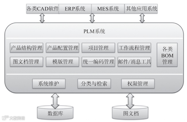 (2)PLM(产品生命周期管理系统):它负责产品设计的图文档、设计过 程、设计变更、工程配置的管理,为ERP系统提供最主要的数 据源BOM表,同时为MES系统提供最主要的数据源工艺路线文件。