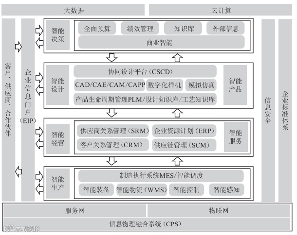基于企业系列标准的支持和企业级别的信息安全要求,在信息物理融合系统(CPS)的支持下,构建智能设计、智能产品、智能经营、智能服务、智能生产、智能决策六大系统。