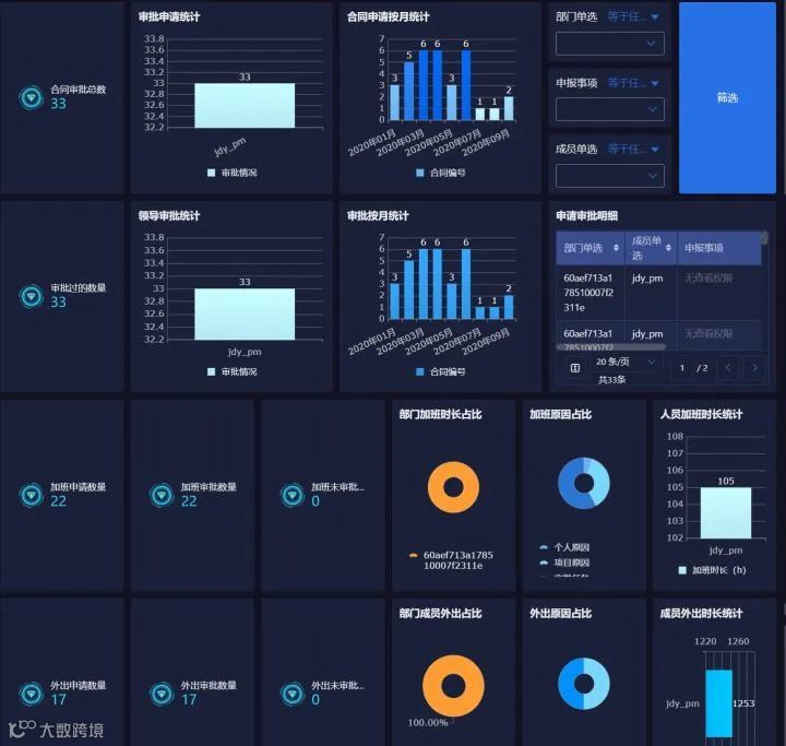 还是用上面的OA系统来说,数字化的OA不仅仅是简单的信息统计,还会基于收集到的数据进行分析,生成详实的数据分析图表,这些图表就是用来给决策者提供科学决策依据的。