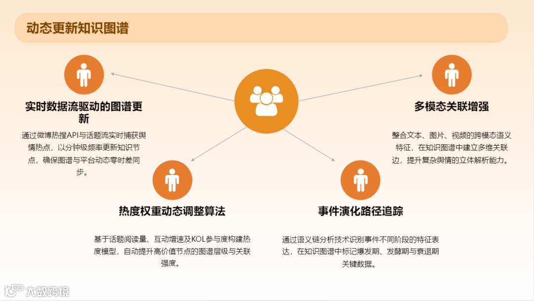 实现知识图谱动态更新:基于热搜变化、话题热度、用户互动趋势及事件节点,持续更新知识图谱,确保舆情信息与平台节奏同步,提供最新、最鲜活的内容支持。