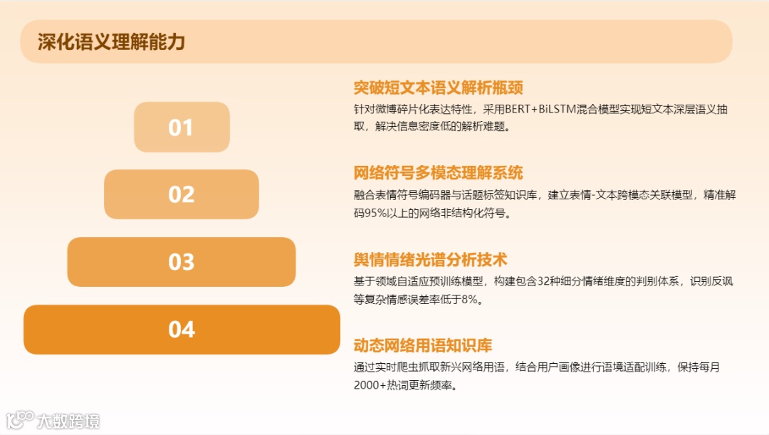 深化语义理解能力:针对微博短文本、表情符号、话题标签、网络用语、梗文化及专业缩略语进行深度解析,准确识别情绪倾向、讽刺语气与隐喻表达,全面把握舆情语境与演变趋势。