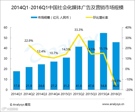 根据Analysys易观发布的《中国社会化媒体广告及营销市场季度监测报告2016年第1季度》数据显示,2016年第1季度,中国社会化媒体广告及营销市场规模达到46.0亿元人民币,较2015年第4季度环比下降16.1%,较2015年第1季度同比增长47.4%。