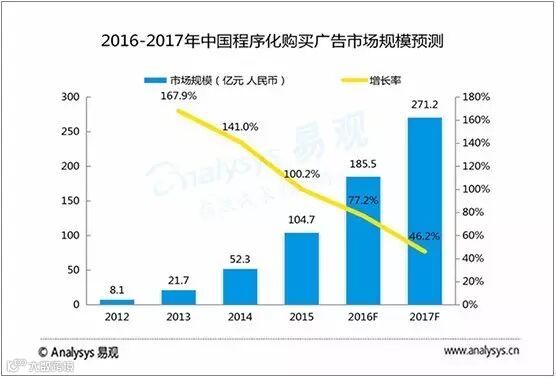 2015年,中国程序化广告市场规模为104.7亿元人民币,增长率为 100.2%,预计到2016年,中国程序化购买市场规模将达到185.5亿元人民币,同比增长77.2%。